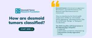 Learn more about the World Health Organization’s (WHO) classification of desmoid tumors, which is listed under Table II – Fibroblastic/Myofibroblastic Tumours: https://pmc.ncbi.nlm.nih.gov/articles/PMC8167394